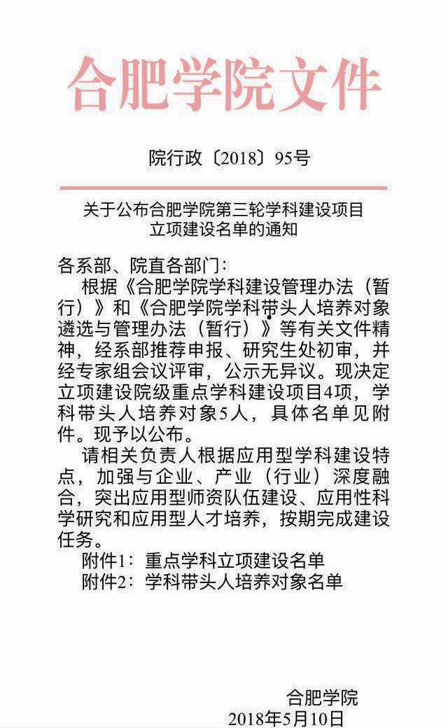 根據《合肥學院學科建設管理辦法(暫行)》和《合肥學院學科帶頭人培養對象遴選與管理辦法(暫行)》等有關文件精神,合肥學院第三輪學科建設項目經系部推薦申報、研究生處初審,并經專家組會議評審,公示無異議。2018年5月10日合肥學院的院行政〔2018〕95號文件公布了合肥學院第三輪學科建設項目立項建設名單,立項建設的院級重點學科建設項目4項,學科帶頭人培養對象5人。其中,馬克思主義學院的馬克思主義理論獲院級重點學科立項建設(2018xk04),負責人是胡艷萍。 此次立項建設的馬克思主義理論重點學科建設有三個學科方向: 學科方向一為思想政治教育,學科方向學術帶頭人為胡艷萍,學術隊伍有王霞、張波、周坤3位老師。 學科方向二為馬克思主義基本原理,學科方向學術帶頭人為金小方,學術隊伍有蘇冰、金麗、劉昆3位老師。 學科方向三為馬克思主義中國化研究,學科方向學術帶頭人為朱鳳琴,學術隊伍有黃瑩瑩,王能引,詹玉華3位老師。 學校要求相關負責人根據應用型學科建設特點,加強與企業、產業(行業)深度融合,突出應用型師資隊伍建設、應用性科學研究和應用型人才培養,按期完成建設任務。(馬克思主義學院) |