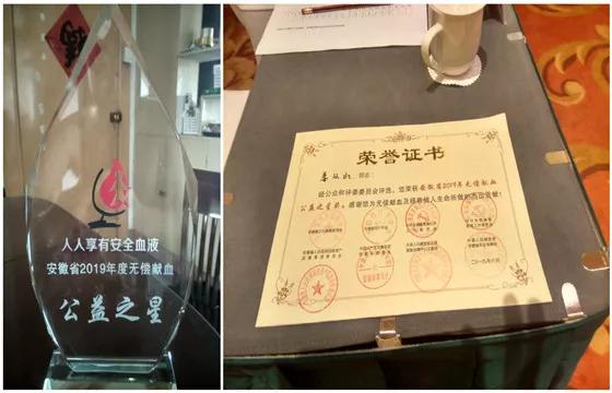 堅持不懈 用愛心為人生加冕 從2011年首次參加無償獻血起,8年來他共捐獻全血7次、2800毫升,單采血小板93次,先后榮獲2014——2015年度全國無償獻血奉獻獎金獎、2016——2017年度全國無償獻血奉獻獎銀獎,還榮獲2017年安徽省教科文衛體系統師德先進個人、2018年度助人為樂類“合肥好人”稱號、2019年安徽省無償獻血公益之星稱號等榮譽。