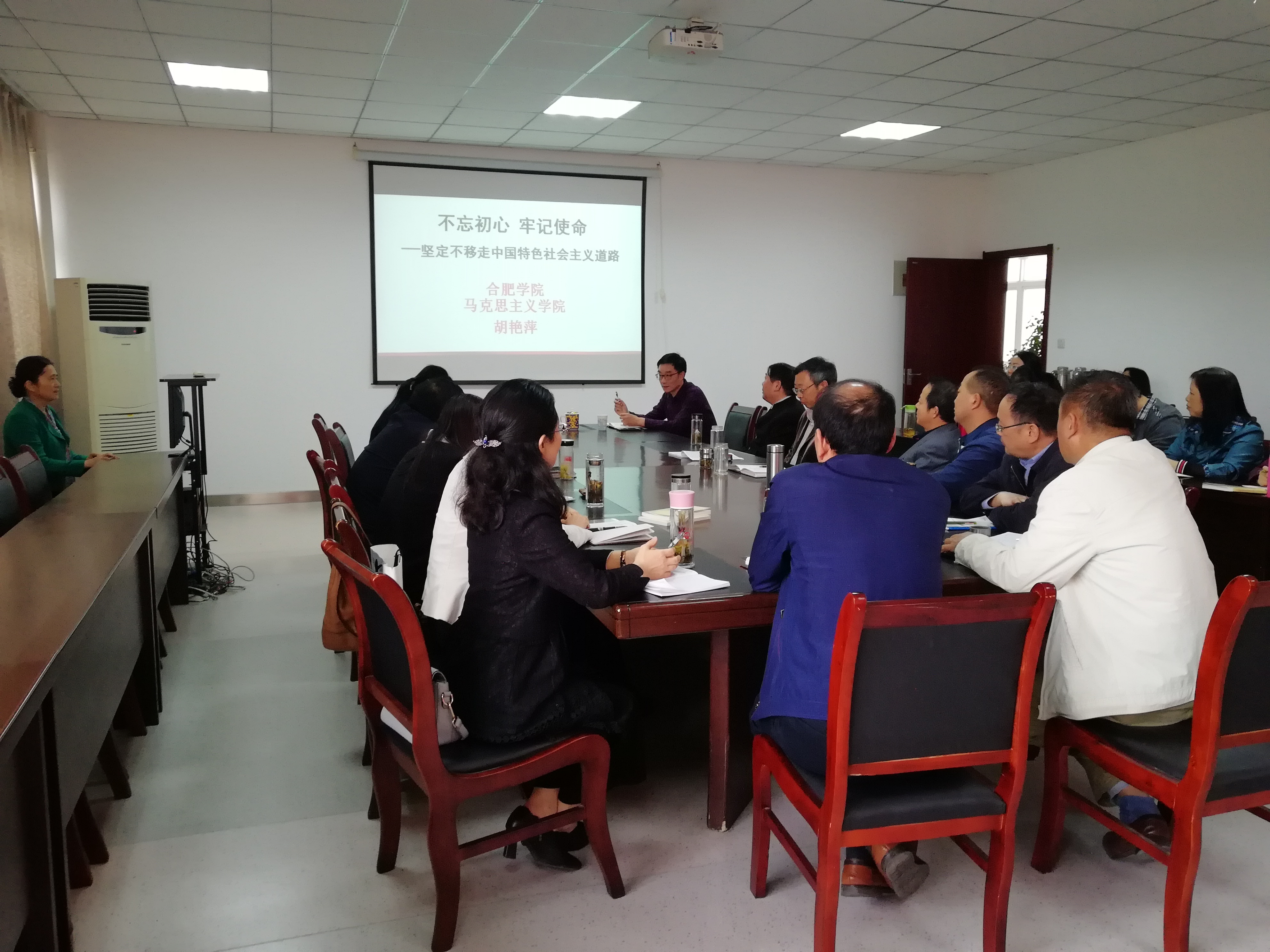 116日下午,馬克思主義學(xué)院院長胡艷萍以“不忘初心、牢記使命——堅定不移走中國特色社會主義道路”為題,結(jié)合自己的學(xué)習(xí)體會、調(diào)研成果和深入思考,為馬克思主義學(xué)院全體教職工講授了一堂生動的黨課。學(xué)校黨委委員、黨委宣傳部統(tǒng)戰(zhàn)部部長、馬克思主義學(xué)院直屬黨支部書記劉樟樹全程參加。