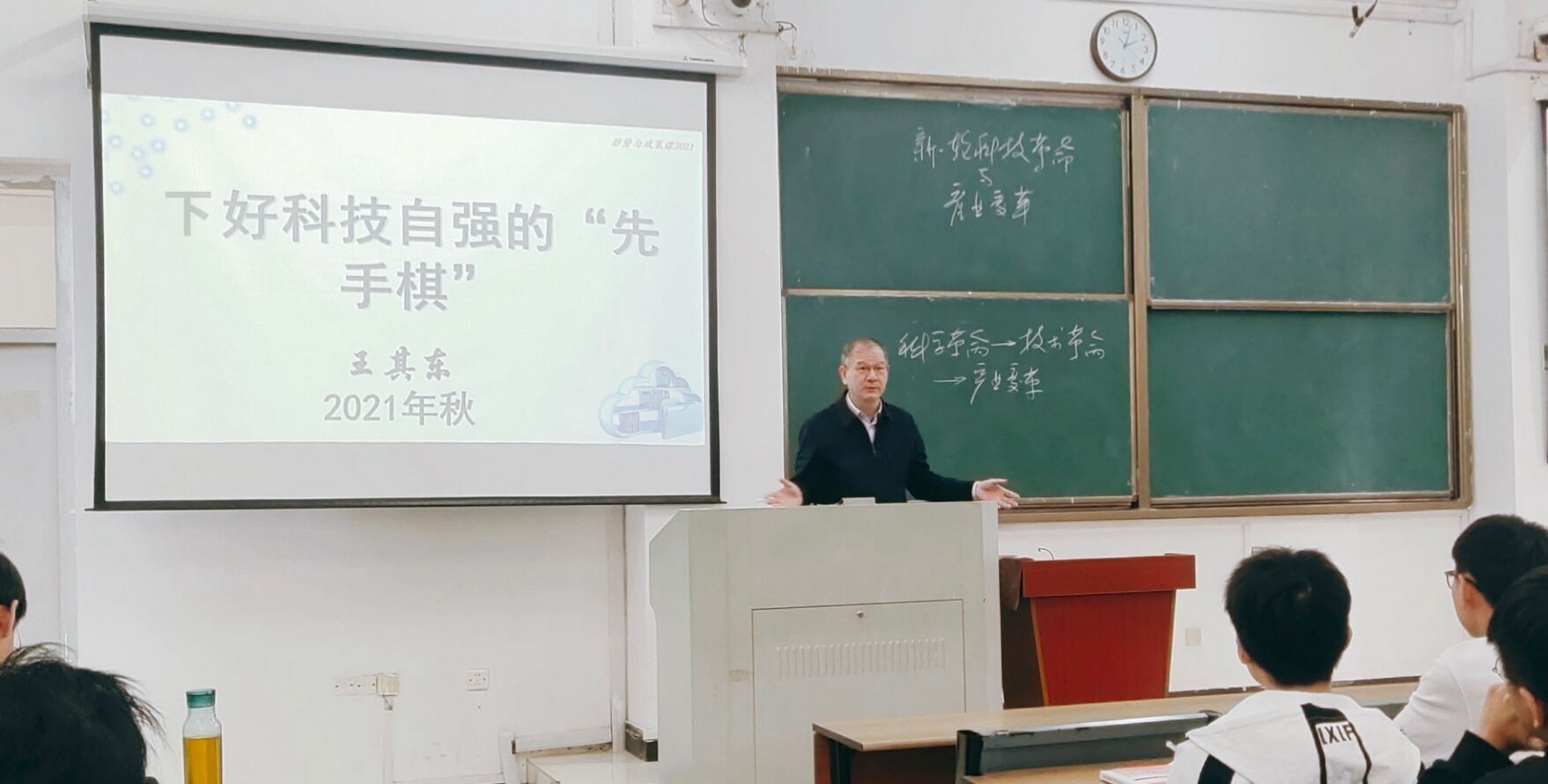 首先,王書記以下圍棋的“先手”與“后手”為喻,從近日召開的“國家科學(xué)技術(shù)獎(jiǎng)勵(lì)大會(huì)“談起,向同學(xué)們介紹了科技自立自強(qiáng)是黨的十九屆五中全會(huì)提出的國家發(fā)展重要戰(zhàn)略支撐,也是站在新的歷史起點(diǎn)上,加快建設(shè)科技強(qiáng)國的重要部署。我國將科技自立自強(qiáng)作為國家發(fā)展戰(zhàn)略支撐的主要原因在于,黨的十八大以來,我國科技事業(yè)取得了舉世矚目的成就,但科技發(fā)展水平特別是關(guān)鍵核心技術(shù)研發(fā)能力、重大原始創(chuàng)新能力、基礎(chǔ)研究水平同國際先進(jìn)水平相比還有一定差距,同全面建設(shè)社會(huì)主義現(xiàn)代化國家的要求還很不適應(yīng)。人們迫切需要科學(xué)技術(shù)解決方案,需要增強(qiáng)科技創(chuàng)新第一動(dòng)力。 接著,他簡要介紹了當(dāng)前世界科技發(fā)展形勢(shì)。他指出,以中國為代表的新興經(jīng)濟(jì)體對(duì)科技創(chuàng)新的貢獻(xiàn)度不斷上升,世界科技力量格局重構(gòu),科技競爭更加激烈,世界主要國家都在加快尋找科技創(chuàng)新的突破口,搶占未來發(fā)展的話語權(quán)和主動(dòng)權(quán)。