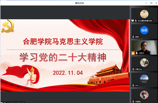 學深悟透黨的二十大精神 ——馬克思主義學院學習黨的二十大精神(二) 11月4日下午,馬克思主義學院再次開展學習貫徹黨的二十大精神線上學習會。馬院全體專兼職思政課教師參加學習。 會上,馬院副院長馬保衛帶領全體專兼職教師認真學習了黨的二十大報告。馬院長指出,二十大報告深刻闡釋了新時代堅持和發展中國特色社會主義的一系列重大理論和實踐問題,描繪了全面建設社會主義現代化國家、全面推進中華民族偉大復興的宏偉藍圖,為新時代新征程黨和國家事業發展、實現第二個百年奮斗目標指明了前進方向、確立了行動指南,是黨和人民智慧的結晶,是黨團結帶領全國各族人民奪取中國特色社會主義新勝利的政治宣言和行動綱領,是馬克思主義的綱領性文獻。學習宣傳貫徹黨的二十大精神是當前和今后一個時期的首要政治任務,馬院全體教師要圍繞“九個深刻領會”,全面準確學習二十大精神,深入理解內涵,精準把握外延。要原原本本、逐字逐句學習黨的二十大報告和黨章,學習習近平總書記在黨的二十屆一中全會上的重要講話精神,切實把思想和行動統一到黨的二十大精神上來。