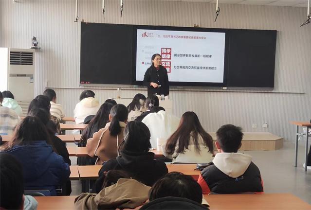 陳秀副院長(zhǎng)指出,習(xí)近平總書記關(guān)于教育的重要論述是師范專業(yè)學(xué)生的必修課,我們要深刻理解習(xí)近平總書記關(guān)于教育的重要論述的科學(xué)內(nèi)涵和重大意義。她希望同學(xué)們既刻苦鉆研理論知識(shí),又積極掌握專業(yè)技能,立足國(guó)際視野、家國(guó)情懷、集體精神和創(chuàng)新思維的新時(shí)代人才基本需求,不斷提高與時(shí)代發(fā)展要求相適應(yīng)的素質(zhì)和能力,做到德智體美勞全面發(fā)展,努力成長(zhǎng)為黨和人民需要的有用之才。最后,她結(jié)合師范專業(yè)特點(diǎn),強(qiáng)調(diào)立德樹(shù)人是教育的根本任務(wù),以身作則地告訴同學(xué)們要高標(biāo)準(zhǔn)嚴(yán)格要求自己,錘煉扎實(shí)本領(lǐng),努力成為一個(gè)有理想信念、有道德情操、有扎實(shí)學(xué)識(shí)、有仁愛(ài)之心的“四有”好老師,肩負(fù)起時(shí)代賦予的重任。 陳秀副院長(zhǎng)精彩生動(dòng)的思政課為將來(lái)走向教師工作崗位的師范生以思想啟迪。課后,同學(xué)們紛紛表示會(huì)牢記陳秀副院長(zhǎng)的囑托和要求,刻苦學(xué)習(xí),不斷提高自己的專業(yè)技能和素養(yǎng),無(wú)愧于時(shí)代、無(wú)愧于人民、無(wú)愧于青春。(馬克思主義學(xué)院)