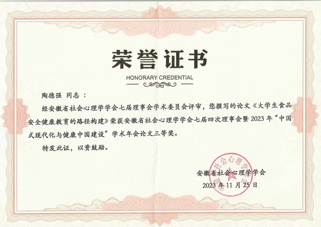 我院教師在安徽省社會心理學會2023年學術年會上獲獎 11月25日,安徽省社會心理學會七屆四次理事會暨2023年學術年會在銅陵召開。我院教師陶德強博士受邀參會,所提交論文榮獲年會論文三等獎。