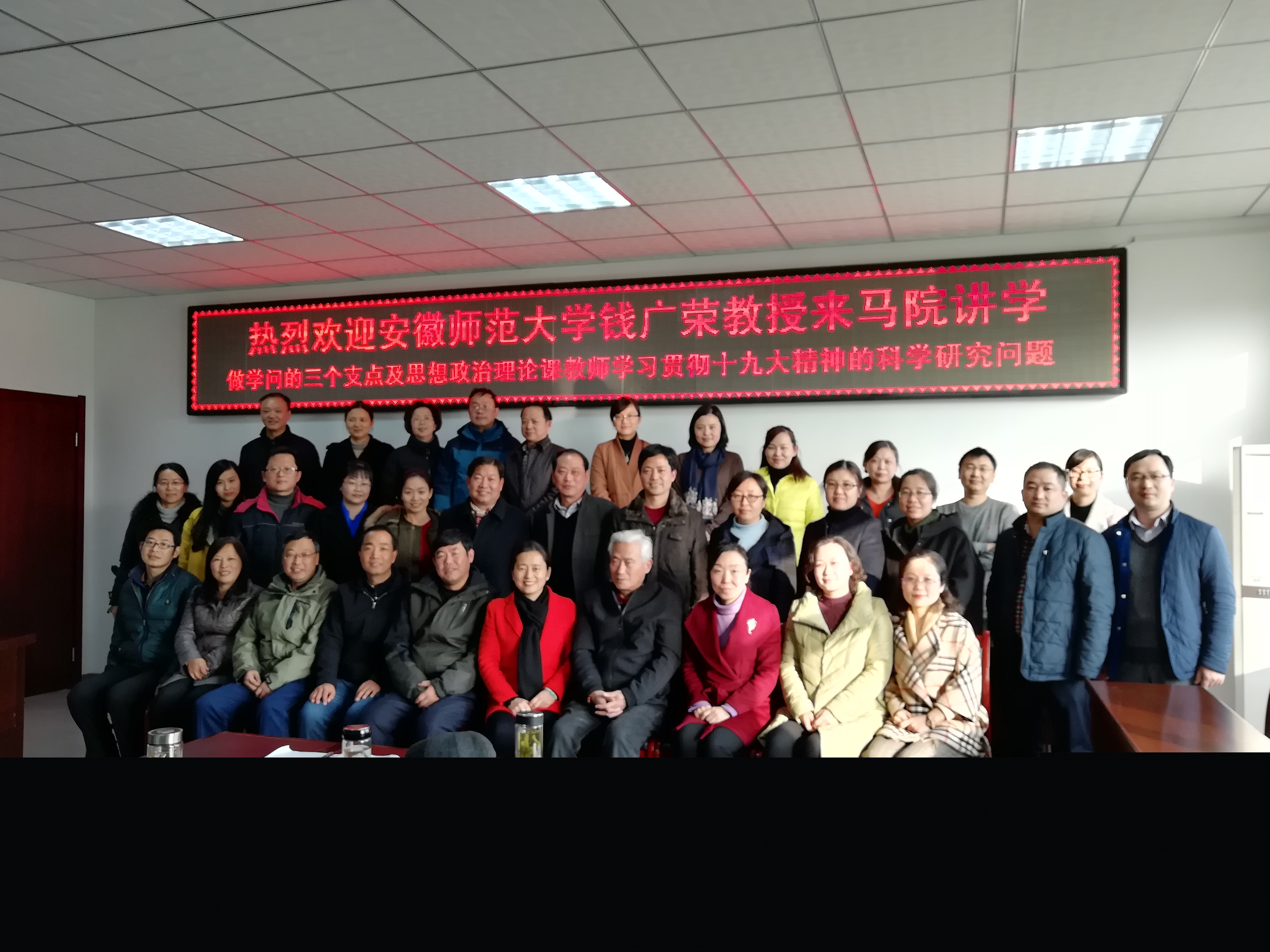 2017年12月6日下午,安徽師范大學錢廣榮教授應邀到合肥學院馬克思主義學院講學,錢教授以《做學問的三個支點和思想政治理論課教師學習貫徹十九大精神的科學研究問題》為題作學術報告。馬克思主義學院胡艷萍院長主持,全體思政課專兼任教師到場聆聽,報告在馬克思主義學院會議室舉行。