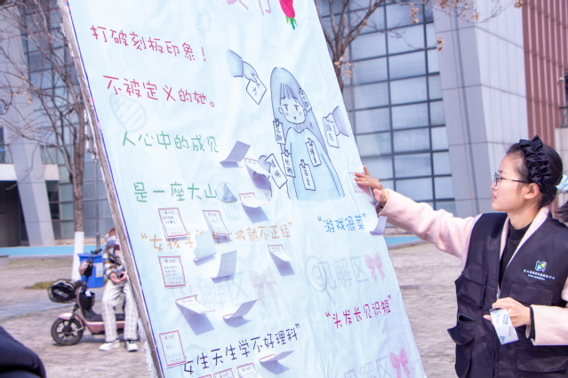 活動當天,工作人員提前做好準備,將活動現場精心布置,吸引了眾多師生駐足參與。活動利用展牌展示了當今社會中對女性的一些偏見和觀念束縛。參與者們通過在便簽上書寫自己的想法并貼到展牌上,表達對自我的認同與支持。這種互動形式不僅讓參與者們得到溫暖和鼓勵,也為在場的每一個人帶來了力量。此外,活動現場還準備了豐富的文創禮品,進一步激發了師生們的參與熱情。文創禮品與活動主題緊密結合,成為傳播活動理念的載體,吸引了更多人關注女性權益與多元價值。