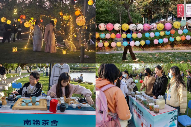 日暮西沉,一期湖畔漸次亮起萬千燈火。電子愛好者協會以科技賦能傳統,流光溢彩的電子花燈引人駐足;南艷茶舍前茶煙裊裊,學子們碾茶煮茗,體味晴窗細乳戲分茶的雅致;生物創新之光協會將釀酒古法融入節慶,花燈伴佳釀,暗香浮動月黃昏。靈心居手工社的巧手生花,ART手繪協會的妙筆丹青,無不展現著傳統文化的當代活力。 月上柳梢時,猜燈謎、放河燈等傳統活動將氣氛推向高潮。盞盞明燈隨波遠去,載著學子們的美好祈愿;笑語歡聲間,沙包投擲、尋寶探險等活動更添節慶趣味。湖光燈影兩相和,一時多少詩意。