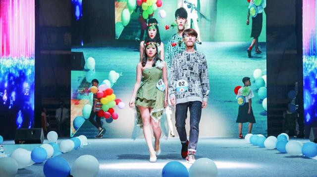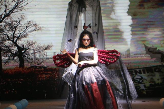 比賽伊始,活動現場播放了來自各大高校的祝福視頻。隨后,13個系的模特代表便依次為觀眾呈現了一場絢麗繽紛的開場秀表演,比賽正式拉開帷幕。第一個上場的機械系模特隊伍,設計師們以綠色為主色調,與當下季節相襯,給人視覺上的清爽,贏得了在場觀眾的歡呼。而外語系則以童話故事為背景,最引人注目的是一位守護著原始部落的自由女神,身著以廢舊光盤為主要原料、通過紙片和舊報紙的分割重組形成一個全新的服裝造型,突出了綠色環保、大膽創新的服裝設計原則,富有跳躍感而又不失沉穩。