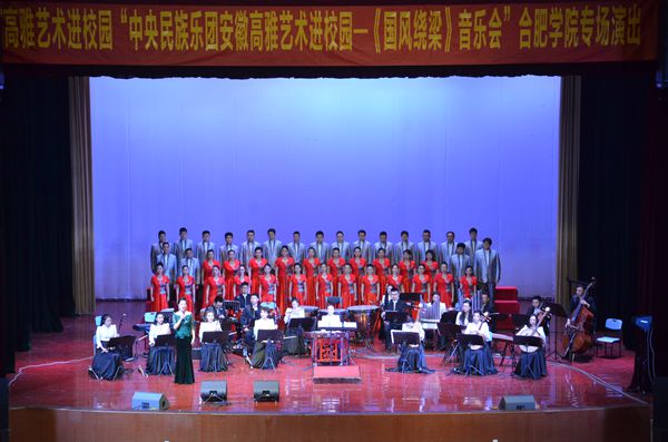 10月25日晚,我校致用禮堂座無虛席、掌聲雷動。由教育部、文化部、財政部聯合主辦的,我校承辦的“高雅藝術進校園‘中央民族樂團安徽高雅藝術進校園——《國風繞梁》音樂會’合肥學院專場演出”活動在我校一期致用禮堂隆重舉辦。中央民族樂團黨委書記魏軍,副團長趙東升,合肥學院黨委委員、紀委書記洪家友及相關系部、職能部門負責人出席,千余名師生觀看了演出。