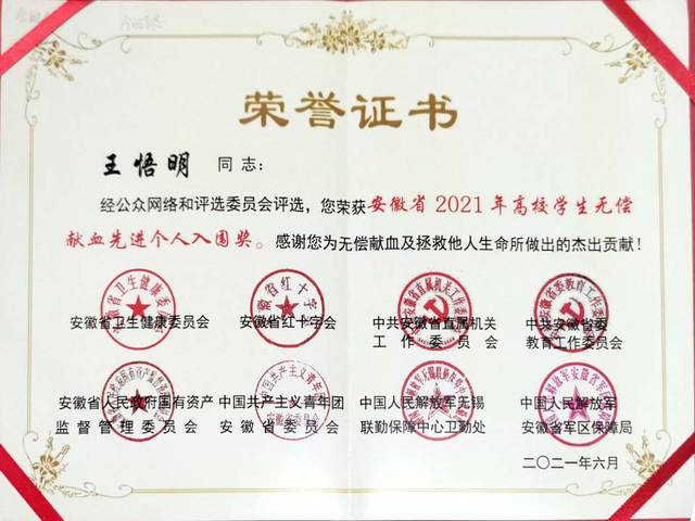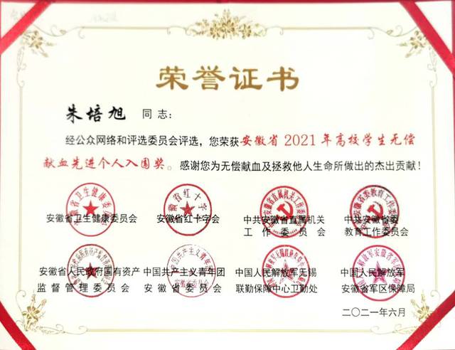 近日,由安徽省衛(wèi)生健康委員會(huì)、安徽省紅十字會(huì)、中共安徽省直屬機(jī)關(guān)工作委員會(huì)、中共安徽省委教育工作委員會(huì)等部門共同主辦的安徽省2021年無(wú)償獻(xiàn)血公益之星和先進(jìn)集體評(píng)選表彰活動(dòng)的評(píng)選結(jié)果揭曉。我校朱培旭、王悟明兩位同學(xué)獲安徽省2021年度高校學(xué)生無(wú)償獻(xiàn)血先進(jìn)個(gè)人入圍獎(jiǎng)。