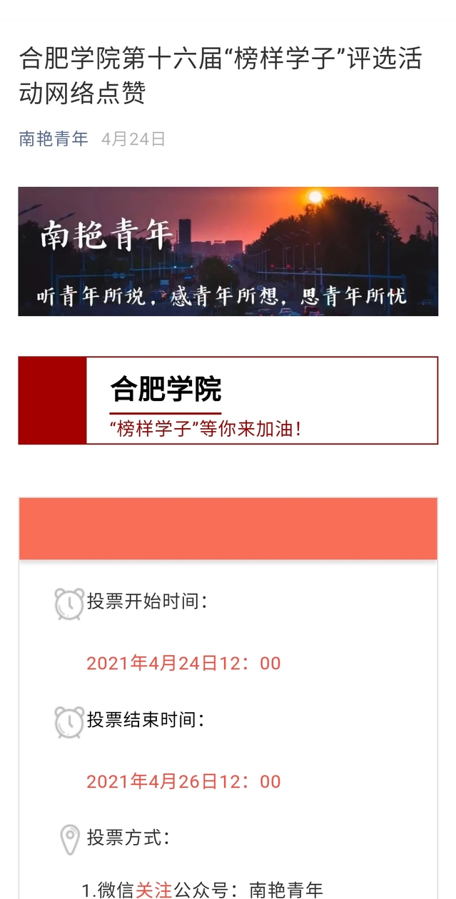 校團委重新修訂完善了《合肥學院“榜樣學子”評選辦法》,自評選通知發出后,各二級學院大力宣傳,鼓勵優秀學生申報,通過組織推薦和個人自薦相結合的方式,共收到報名材料五十余份。校團委牽頭召開組委會評審會議,由宣傳部、學生處、教務處、大學生創新創業教育中心等部門領導擔任評委,根據候選人個人材料,按照道德示范、學風創優、科技創新、社會實踐、志愿服務、自主創業、自強奮斗、生態保護、文藝創作和體育鍛煉十個方面,評選出“榜樣學子”正式候選人18名。