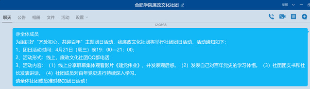 此次團日活動主要以主題會議的形式展開。當天晚上七點,參與活動的同學們早已提前進入QQ群語音。會議伊始,社團團支書李致遠發言,向大家介紹此次團日活動的主要內容和開展的重要性。隨后便是集體觀看電影《建黨偉業》精選片段,通過觀看電影,感受了革命先輩崇高的信仰,進一步加深了社員們對黨的歷史和黨的路線、方針、政策的認識,同時也營造出濃厚的愛國主義教育與氛圍,激發了社員們學習和發揚革命先輩艱苦奮斗、無私奉獻的革命精神。緊接著,團支書帶動大家一起發表觀后感,并討論自己對百年黨史的學習感悟,同學們紛紛被打動,更加踴躍發言。最后,團支書和社長發言,就此次活動做了簡單總結,激勵社團成員對百年黨史進行持續深入學習,不忘初心。
