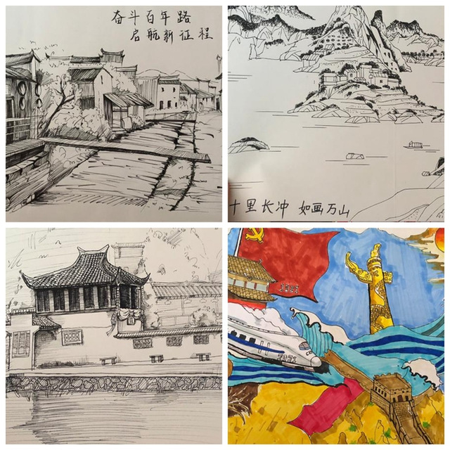 在完成金絲皇菊的包裝設(shè)計(jì)和周邊文創(chuàng)產(chǎn)品設(shè)計(jì)后,團(tuán)隊(duì)成員還舉辦了主題為“禮贊建黨百年,書畫美麗鄉(xiāng)村”的慶祝建黨100周年書畫和手工作品展。同學(xué)們緊扣“農(nóng)業(yè)、農(nóng)村、農(nóng)民”主題,突出建黨100年來我國農(nóng)村翻天覆地的變化。活動中,大家準(zhǔn)備了各式各樣的工具,如超輕粘土、卡紙、膠水等等,充分發(fā)揮專業(yè)特長,在三天時間內(nèi)完成了繪畫、書法、手工作品共60余件,準(zhǔn)備近期在萬山鎮(zhèn)文化館展出。