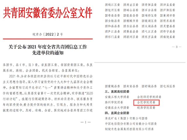 為樹立典型、鼓勵先進,進一步推動信息工作再上新臺階,共青團安徽省委在全省范圍內評選出“2021年度全省共青團信息工作先進單位”70家,合肥學院團委獲得該榮譽稱號。