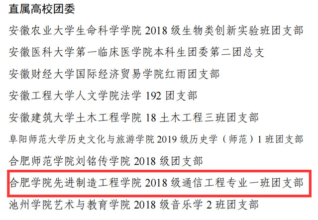 近日,團省委發布《共青團安徽省委關于表彰安徽省五四紅旗團委(團支部)、安徽省優秀共青團員、安徽省優秀共青團干部的決定》(皖青〔2022〕4號),我校先進制造工程學院2018級通信工程專業一班團支部榮獲“安徽省五四紅旗團(總)支部”稱號,經濟與管理學院汪欣楠榮獲“安徽省優秀共青團員”稱號。