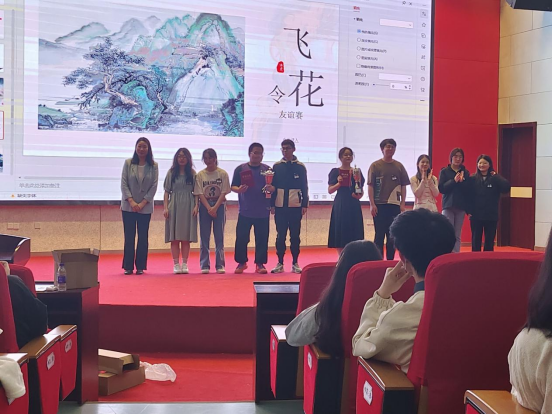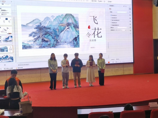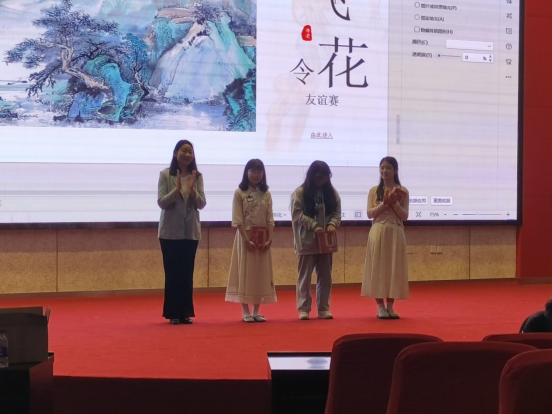 最后的友誼賽環節為“飛花令”,24位選手根據他們所抽到的數字重新組成新的4支隊伍,共同展開接下來的比賽。比賽過程緊張而激烈,選手們睿智從容、淡定自若,出口成章、佳句迭出,應答自如、精彩不斷。四支隊伍兩兩交鋒、角逐冠軍,選手們你來我往、互不相讓,現場掌聲不斷,氣氛熱烈。