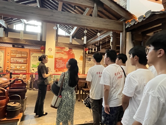 績溪是徽菜的發(fā)源地之一,7月17日下午,調(diào)研組的同學(xué)參觀了徽菜博物館,在講解員的帶領(lǐng)下,同學(xué)們逐一參觀各個展區(qū),詳細了解了徽菜的歷史淵源、發(fā)展歷程以及烹飪技藝,對徽菜文化的深厚底蘊有了更深刻的認識,領(lǐng)略到徽州的風(fēng)土人情和燦爛的徽州文化。