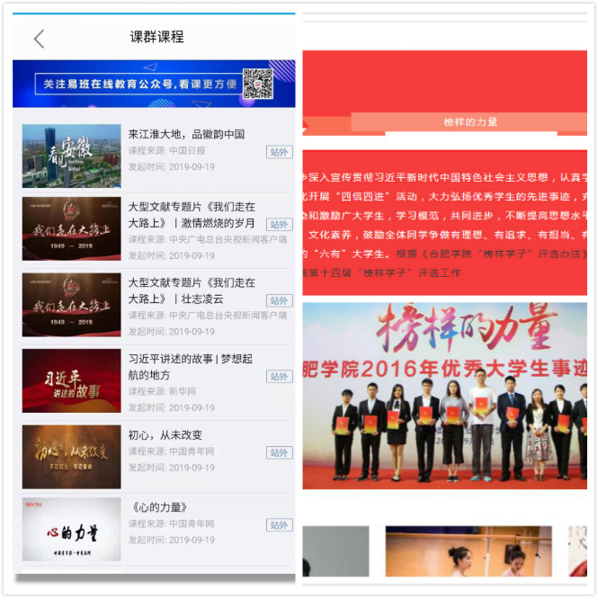 開設“打CALL新時代”新聞專欄,提高學生對中國新時代變化的關注,形成了合院特色的“易”品牌;開設小易講兩會專欄,引導青年線上學習五四精神;協同宣傳部開展“我和我的祖國”作品征集活動,激發學生的愛國主義情感,培養學生良好的愛國情操;開展慶祝人民空軍成立70周年活動,傳播新中國英雄歷史,宣揚英雄的“空軍精神”,引導學生在易班平臺評論祝愿,得到學生的熱情參與和認可。組織學生通過電腦或手機訪問“偉大歷程 輝煌成就 慶祝中華人民共和國成立70周年大型成就展”網上展館,身臨其境感受新中國成立70年來的偉大歷程和輝煌成就。協同團委進行“榜樣學子”活動宣傳,發揮榜樣的示范引領作用,有效地拓展大學生思想政治教育的途徑;開辟小易講熱點微社區,將校園熱點與社會主義核心價值觀有機融合,強化大學生思想引領。易班建設與發展成功申報我校社會主義核心價值觀教育優秀案例。