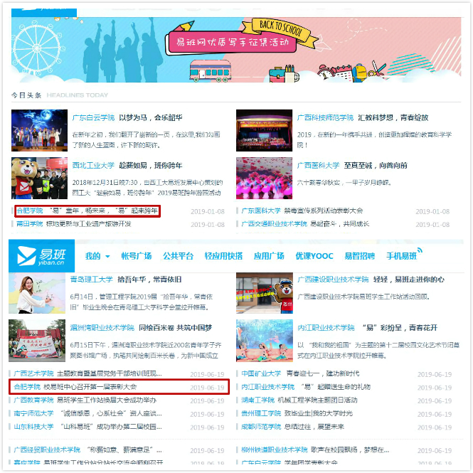 舉辦“易”起建設新家園社區美化大賽,提供學生參與社區文化建設的平臺;制作近百篇學習生活攻略,提升學生學習生活技能;組織團隊學生骨干參加2019年大學生暑期“三下鄉”社會實踐活動。組織開展第一屆易班主題宣傳周“網薪商城,狂熱來襲”、設計制作及購買了一系列易班周邊學習產品,提升同學們對易班的了解、興趣,進一步增加學生使用易班的粘性。易打印服務2019年免費為學生打印學習資料2000多份。圍繞學生需求,打造線上線下失物招領平臺。開展合肥市城鄉居民醫療保險政策宣傳,提高學生對合肥市城鄉居民醫療保險新政策的知曉率。開展大學生網絡思想政治狀況問卷調查、輔導員進社區問卷調查、物業滿意度調查、本科生學習滿意度調查,使用大數據分析指導思政工作,提升思政教育實效性。