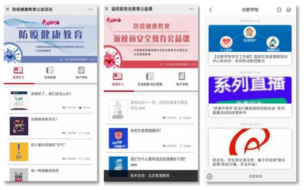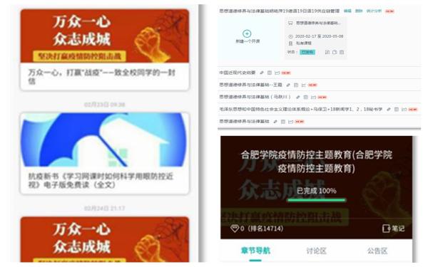 學校利用易班網絡平臺實時向師生發布相關信息和相關工作要求,自2020年1月26日起不間斷推送各類疫情防控專題帖20余篇。在易班網上策劃開設“抗擊疫情 易起戰斗 ”主題版塊,在省內高校中率先組織線上“易同戰疫,共克時艱”防疫健康主題教育,及時發布“抗擊疫情,眾志成城,為中國加油!” 全國校園抗擊疫情主題公益歌曲MV征集、“并肩抗‘疫’,你我都在前線!”抗擊疫情主題征稿,積極推送《合肥學院致全校學生的一封信》《萬眾一心,打贏“戰疫”——致全校學生的一封信》,認真組織全體學生參加“全國大學生同上一堂疫情防控思政大課”直播學習,教育引導為學生穿上思想“防護服”,有效凝聚起眾志成城抗擊疫情的強大正能量。