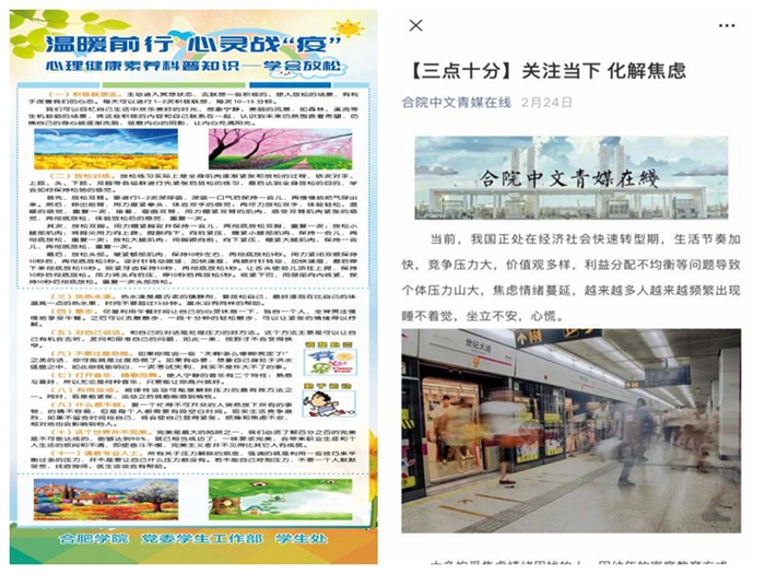 學生處協同各二級學院創新工作方式,同心協力,創新方法,精準施策,繪制保障心理健康“同心圓”。借助網絡媒介,普及心理健康知識,各學院依托學院公眾號、年級群、班級群、朋友圈、微博等平臺加強對學生在春節、網絡開學、社會復工日等特殊時間節點的防疫宣傳,傳播正能量。例如語言文化與傳媒學院利用院公眾號合院中文青媒在線精準推送心理調適系列科普及心理減壓文章,為廣大學生戴上“心理口罩”,先進制造工程學院發表《致先進院同學的一封信》,呼吁學生積極參與各項文體鍛煉,保持健康心態與體魄等;召開視頻會議,發放網絡問卷,及時掌握學生心理現狀,例如城市建設與交通學院各班開展視頻會議,生物食品與環境學院召開畢業班網絡座談會,為同學們提供了集體交流平臺,先進制造工程學院制作并發放針對疫情期間學生學習、生活和心理狀態的電子問卷并對452份有效問卷進行統計分析,了解學生心理狀態,對出現的心理問題給出相應建議;通過線上方式,開展個別談心談話,例如設計學院輔導員針對個別學生疫情期間面對居家生活、學習等壓力出現的心理問題給予指導,疏導其心理壓力;重點關注畢業班學生,疏解其因就業引發的心理壓力,例如經濟與管理學院畢業班輔導員積極推送最新就業招聘信息,并為雙困生、考研考公同學等特殊群體提供心理疏導、求職推薦等就業保障服務,幫助學生解決畢業問題和就業困惑;鼓勵學生在保障自身安全的前提下勇于擔當,奉獻社會,例如教育學院鼓勵心理專業學生利用專業優勢,發揮所長,參與到當地心理關懷志愿服務工作,發揚新時代青年學子的擔當精神,積極傳播正能量。