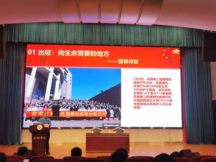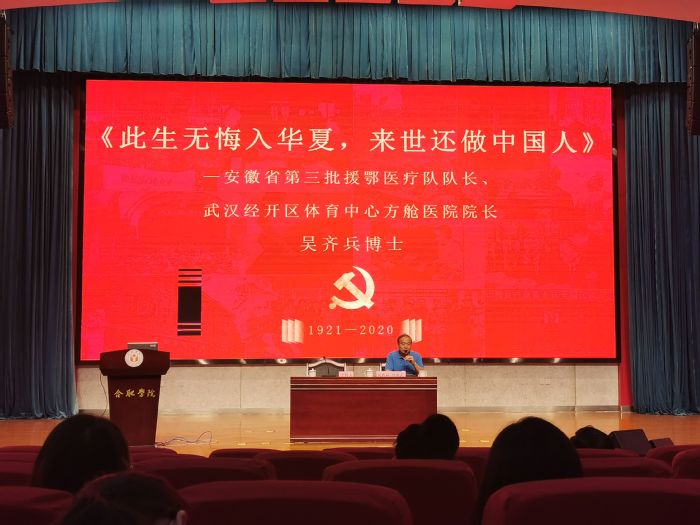 安徽省第三批援鄂醫療隊隊長、安徽醫科大學第一附屬醫院吳齊兵博士應邀作題為《此生無悔入華夏,來世再做中國人》的專題報告,為全體參會人員上黨課。吳齊兵從主動請戰、出發準備、打開局面、取得成效、表彰肯定共五個方面,作了生動講述:安徽第三批援鄂抗疫醫療隊成員共300人,來自安徽省112家醫療單位,從組建到派出不到18個小時。2月9日,醫療隊出征武漢,首戰武漢體育中心方艙醫院,僅用22個小時就完成了方艙醫院現場勘驗、艙內醫用物資完善、隊員工作布置、進艙診療等工作。醫療隊在方艙累計收治491名患者,實現了患者零死亡、醫護人員零感染、患者出院零回頭。3月10日,醫療隊的隊員們首捷方艙后共寫下18封請戰書,希望繼續留在武漢。3月12日,經國家衛生健康委員會批準,安徽第三批援鄂醫療隊正式進駐協和西院,成為安徽省8批醫療隊中唯一連戰兩場的醫療隊。安徽省第三批援鄂醫療隊臨時黨支部在今年“七一”前夕獲安徽省“先進黨組織”表彰,吳齊兵于2020年5月獲得“安徽省五一勞動獎章”表彰。