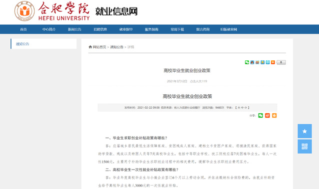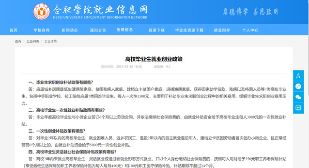 為進一步吸引更多高校畢業生來肥就業創業,近期,合肥市人力資源和社會保障局、合肥市財政局、合肥市經濟和信息化局共同下發了《關于印發<支持高校畢業生來肥就業創業的意見實施細則>的通知》,為進一步鼓勵我校畢業生積極在肥就業創業,服務地方經濟社會發展,我校近期在各二級學院及就業相關部門和廣大畢業生當中,大力開展政策宣傳,讓大家知曉并熟悉在肥就業創業一系列優惠政策。該通知下發后,我校第一時間在就業信息網、微信公眾號等多個官方平臺發布通知,要求各二級學院負責就業工作的老師將此通知轉發至畢業生被班級群中,力爭多渠道、全方位、深層次為畢業生提供在肥就業創業的政策,以引起畢業生的重視,讓更多的畢業生在肥就業、創業。