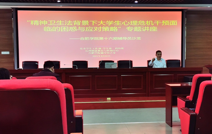 4月21日上午,我校在一期6號樓學術報告廳舉辦第十六期輔導員沙龍,中南大學心理健康教育與咨詢專家唐海波教授應邀為我校學工隊伍作“精神衛生法背景下大學生心理危機干預面臨的困惑與應對策略”專題講座。各二級學院黨委書記、副書記,全體輔導員,學校心理健康教育與咨詢工作的專兼職老師等相關人員聆聽了本次講座。