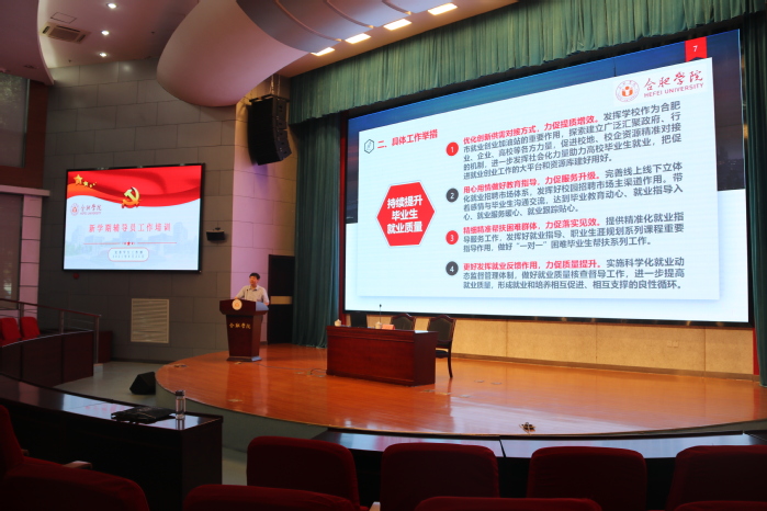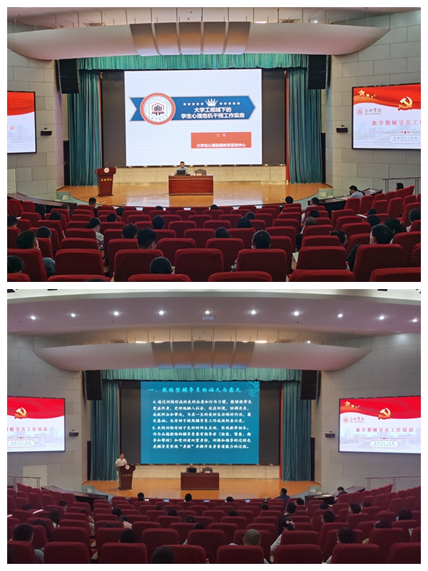 為切實加強輔導員隊伍建設,提升輔導員職業能力和素養,8月25日至26日,我校在圖書館報告廳A廳舉行新學期輔導員培訓。學生處主要負責人、各學院黨委副書記以及全體專職輔導員參加培訓。培訓邀請安徽師范大學朱平教授、安徽工業大學王軍教授作專題報告,校黨委副書記劉建中作專題黨課,培訓由校黨委委員、學工部部長朱濤主持。