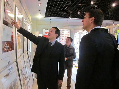 會議結束后,韓北山先生在蔡敬民院長的陪同下參觀了我院藝術設計系德國留學生設計的作品。在中德友誼樹前合影留戀后,韓北山先生又來到中德中心,與在那里學習德語的我院學生進行了交流互動。最后,韓北山先生參觀了我院的二期圖書館和體育館,并對我院的規劃建設贊不絕口