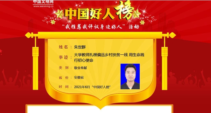 近日,中央文明辦發(fā)布2021年6月“中國(guó)好人榜”,我校教師朱世群榮獲“敬業(yè)奉獻(xiàn)”好人稱(chēng)號(hào)。