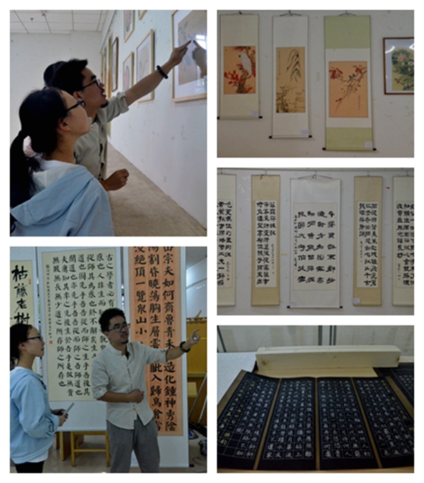 展覽匯集了翰墨軒會(huì)員胡明忠、劉生、石飛翔、葉寧祁、熊祿澤五位同學(xué)近一年的精心準(zhǔn)備的書畫作品,政協(xié)合肥之友書畫院辦公室副主任,安徽省教育學(xué)會(huì)書法教育委員會(huì)理事、副秘書長(zhǎng)馬建軍擔(dān)任翰墨軒指導(dǎo)教師,并提供部分優(yōu)秀作品參與展覽。書法作品有軟筆和硬筆兩種,涵蓋了楷書、隸書、行書等多種字體;陳列方式有中堂、條幅、橫匾、斗方等多樣形式;國(guó)畫以工筆為主,涵蓋花鳥、山水兩大類別??瑫P劃平正、犀利飛動(dòng),行書飄逸超邁、雄健灑脫,草書不拘章法、筆勢(shì)流暢;書法有唐楷對(duì)聯(lián)如“架上有書真富貴,胸中無事即神仙”,有漢碑刻字如《西岳華山廟碑》、《泰山刻石》。國(guó)畫清新自然、細(xì)膩生動(dòng),有工筆類的《牡丹》、《蘭草圖》、《荷塘鴛鴦圖》等,也有寫意類的《花鳥》、《騰云半邊天》、《雙鶴戲竹》。各種風(fēng)骨雄健、奔放軒昂的書畫作品使得校領(lǐng)導(dǎo)一行連聲稱贊,駐足觀賞。