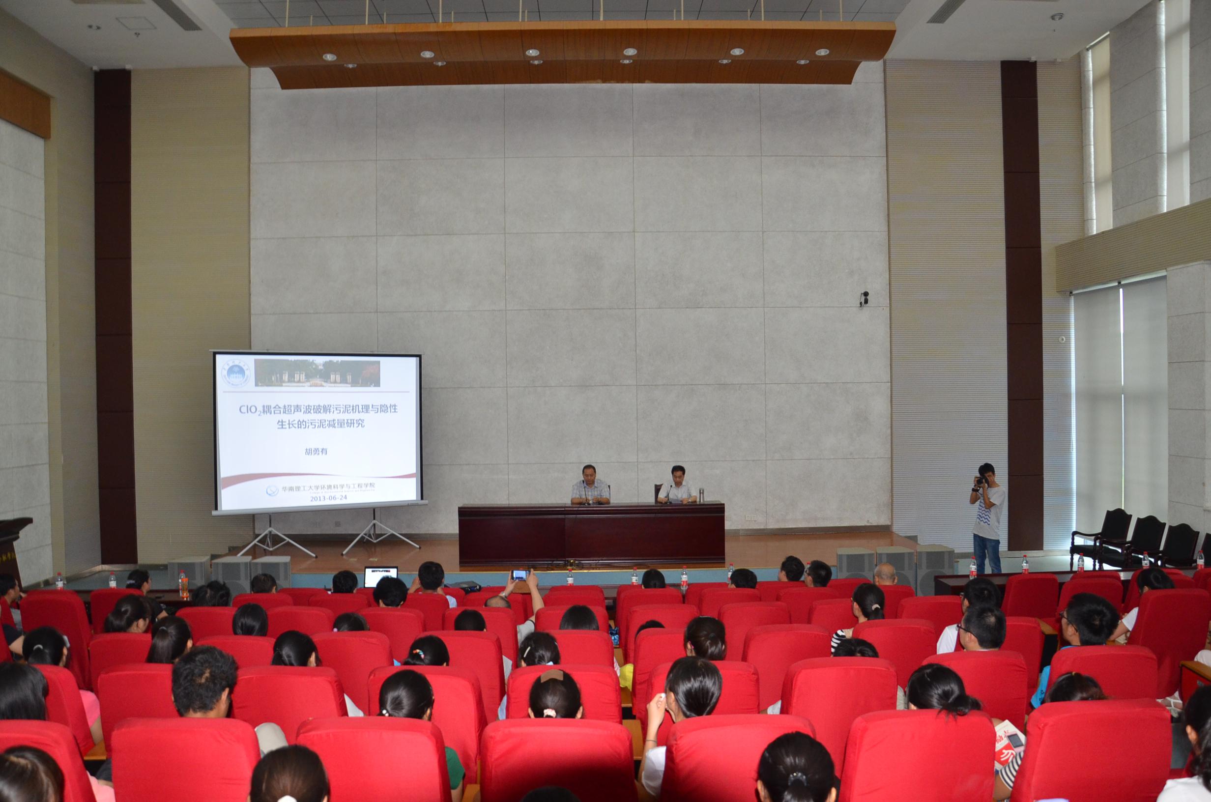 25日上午,全國工程碩士環境工程領域協調組組長、華南理工大學博士生導師胡勇有教授在我院二期圖書館第二報告廳為我院環境工程專業碩士研究生、本科生和有關老師作了一場題為“二氧化氯耦合超聲波破解污泥的隱形生長-污泥減量技術研究”學術報告。院長蔡敬民教授親臨報告會。報告會由副院長陳嘯教授主持。