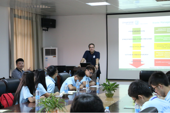 此次夏令營活動持續五天,活動內容包括三個方面:(1)請國內外環境領域的專家作專題報告;(1)參觀先進的環保企業、研究院所和實驗室;(3)自選課題分組開展合作學習與研究。結合本次夏令營主題,特邀請中國國家友誼獎獲得者、德國羅斯托克大學萊勒斯教授,安徽省環境保護廳殷福才副廳長,安徽合大環境檢測有限公司韓蔚總經理,合肥學院科技處處長吳克教授和合肥學院生物與環境工程系主任俞志敏教授等環保領域國內外專家分別作了有關新環保法、德國固廢處理方法和生物炭處理有機污染物、環保案例分析和安徽省環境污染防治與生態修復協同創新中心概況等精彩報告,每個報告都深入淺出的向營員們展示了專家們在這些領域的研究成果。