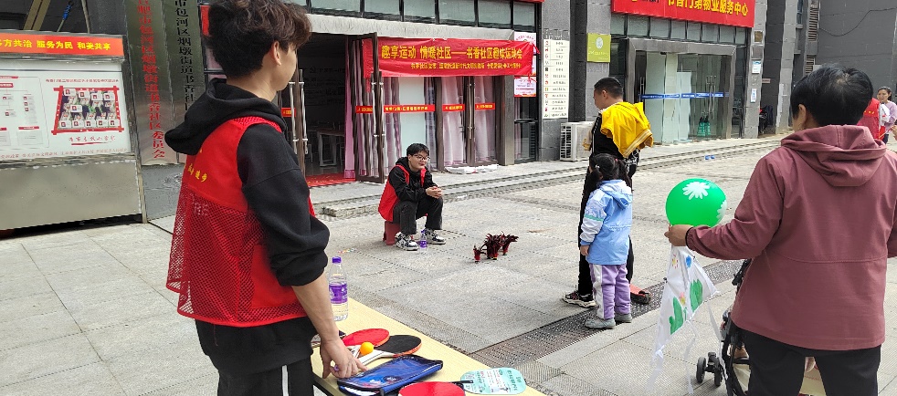 體育節當天,設計學院志愿者早早地來到活動現場,開始了緊張而有序的工作。志愿者們搭建服務臺,負責引導居民參與各個體育項目,解答他們的疑問。體育節活動內容包括跳房子、拉力賽、畫風箏、投壺、踢毽子、乒乓球、大富翁、手腳并用等游戲,在比賽過程中,志愿者們負責現場秩序維護,幫助照看小朋友,并在選手們完成任務后給予蓋章獎勵、兌換獎品。此外,志愿者還擔任部分比賽項目的裁判。