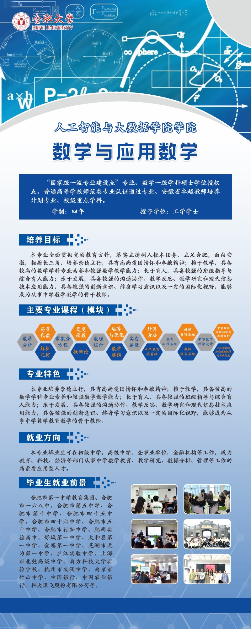 畢業生發展方向:畢業生可在中等教育學校、企事業單位、金融機構等單位從事中學數學教育、教學研究、數據分析、管理等工作也可繼續攻讀碩士學位研究生或出國深造。