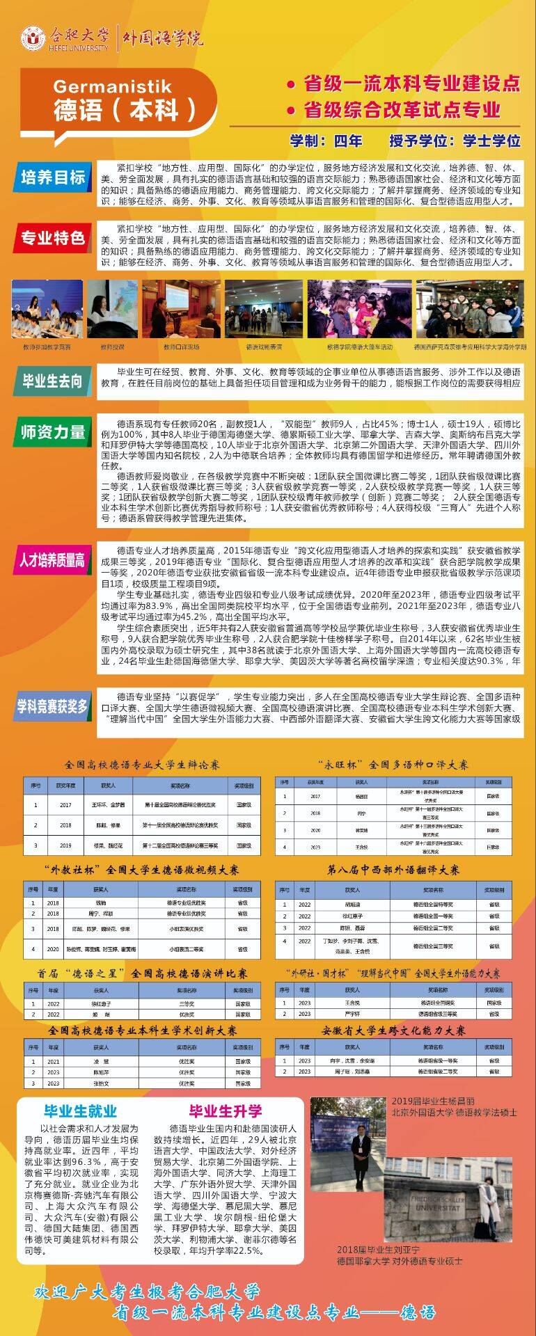 培養目標及特色:本專業培養德、智、體、美、勞全面發展,具有扎實的德語語言基礎和較強的語言交際能力;熟悉德語國家社會、經濟和文化等方面的知識;具備熟練的德語應用能力、商務管理能力、跨文化交際能力;了解并掌握商務、經濟領域的專業知識;能夠在經濟、商務、外事、文化、教育等領域從事語言服務和管理的國際化、復合型德語應用型人才。本專業借鑒德國應用型大學辦學經驗和歐洲“面向行動”先進外語教育教學理念;強調人才培養跨學科性,培養具有語言運用、商務管理、跨文化交際等能力的復合型人才;將新媒體和互聯網等現代教育信息技術引入課堂教學,提升教學效果;與德國高校共建國際化交流平臺,拓寬學生學習視野。