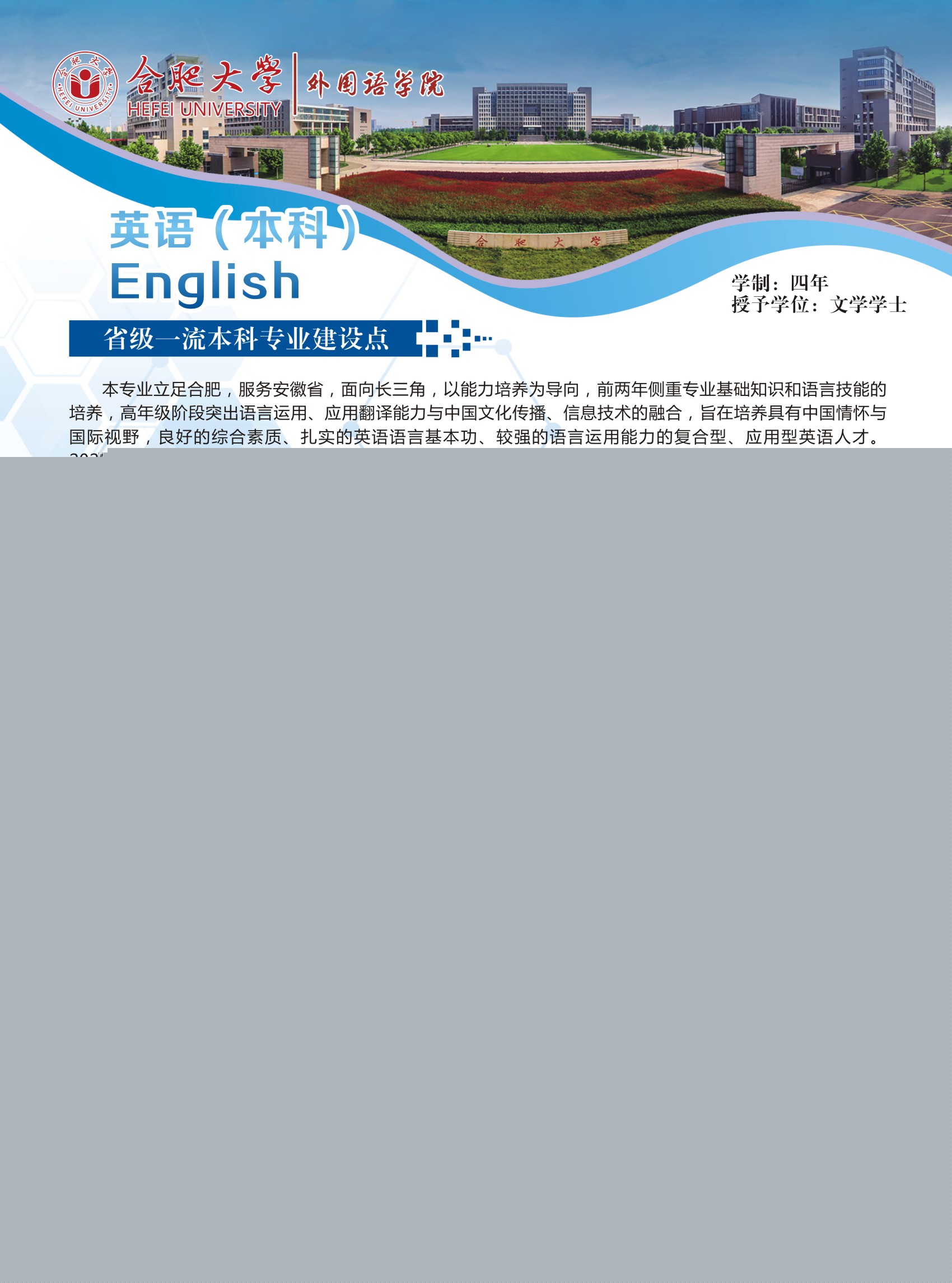 培養目標及特色:本專業培養德、智、體、美、勞全面發展,具有良好的綜合素質、扎實的英語語言基本功、較強的語言運用能力和應用翻譯能力、厚實的英語專業知識和必要的英語教育或商務英語專業知識與技能,能適應安徽、合肥與環巢湖地區區域經濟一體化發展和對外宣傳需要,熟練使用英語從事涉外行業、語言服務行業和英語教育教學等項目管理、應用翻譯、教學等相關工作的具有較高跨文化傳播能力的復合型、應用型英語人才。本專業注重自主學習平臺建設打造分層次的集中實踐和課內實踐教學體系,開拓應用能力培養的課內外輸出路徑,提升了學生講述中國故事、安徽和合肥外宣話語的寫作、演講、翻譯和闡釋能力。