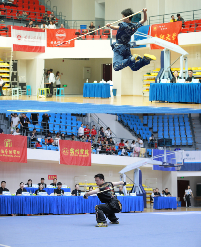 6月18日至23日,2025年安徽省體育聯賽大學生武術比賽在宿州學院舉行。全省44個代表隊、590名運動員參加比賽,我校武術隊在毛獻亮、徐軍老師的指導下,參加了長拳、南棍、南拳、對練等7個項目的比賽,獲得2金2銀的優異成績。其中,孫晨榮獲男子甲組自選南棍冠軍,徐家豪奪得男子甲組自選長拳冠軍,孫晨在男子甲組南拳獲得亞軍,徐家豪、孫晨、王星墨組成的對練隊伍在甲組對練項目中摘得銀牌。