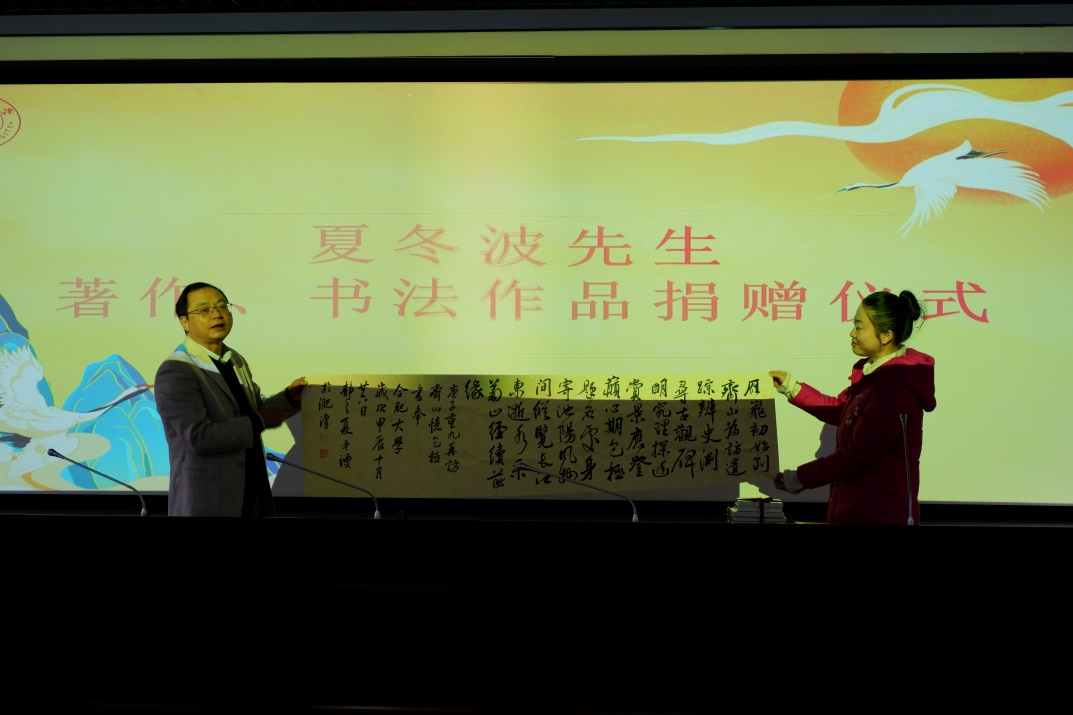 講座開始前,語言文化與傳媒學院院長查金萍介紹了夏冬波處長在文旅領域的豐富經驗和在包公文化挖掘上的貢獻。之后,夏處長向學院贈書并贈予墨寶,現場氣氛熱烈。