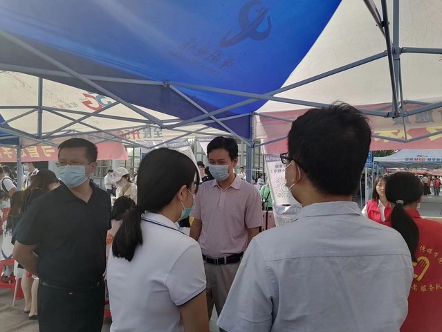隨后,合肥學院黨委巡查辦公室主任丁增云、紀委副書記宋海峰來到文傳學院迎新大本營。在看到了我院迎新工作有條不紊地進行,了解了我院志愿者的一站式迎新服務后,校領導表示肯定和贊揚。