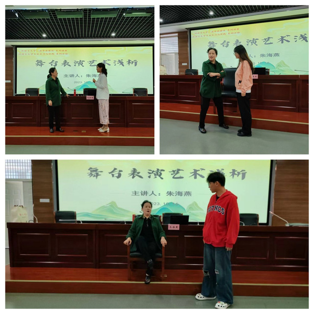 朱海燕院長藝德高尚、藝術(shù)精湛,曾獲中國話劇最高獎——“演員金獅獎”“導(dǎo)演金獅獎”,被安徽省人民政府授予“安徽省先進工作者”、安徽省“十佳文藝工作者”等榮譽稱號。講座中她以自身經(jīng)歷為切入點,結(jié)合曾出演的作品,用精彩的語言和生動的示范,向同學(xué)們闡釋了話劇表演中如何做好角色處理、情緒掌控和語言的表達。朱院長還采用沉浸式體驗的方式和同學(xué)們互動表演,使同學(xué)們現(xiàn)場體驗到話劇舞臺表演的獨特魅力。