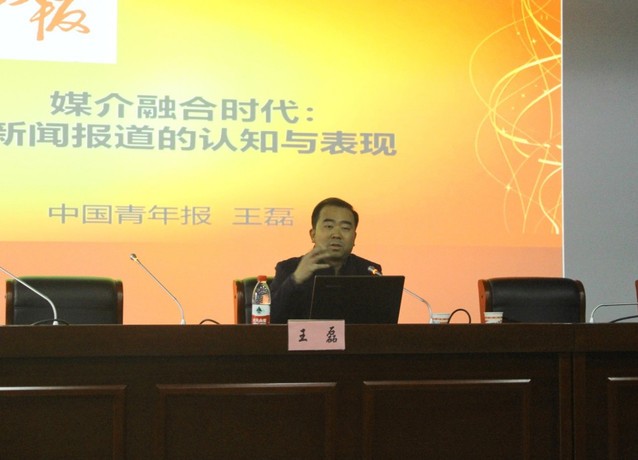 1130日下午兩點半,語言文化與傳媒學院順利舉辦善思講壇中青年學術講座,邀請《中國青年報》安徽記者站站長王磊開展題為媒介融合語境下新聞報道的認知與表現的主題講座。語言文化與傳媒學院院長丁增武,副院長殷明明、副院長查金萍、新聞與數字傳媒系主任張冰清、實驗實訓中心主任唐元等以及文傳學院在校本、碩學生一百余人參加了此次講座。