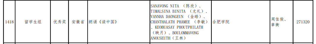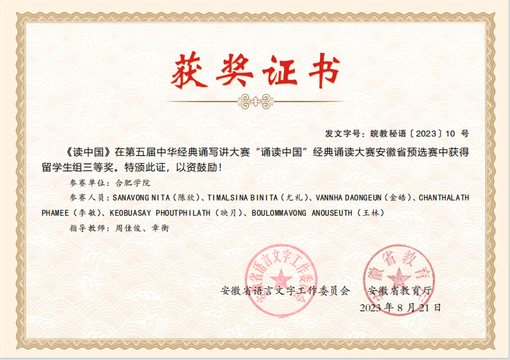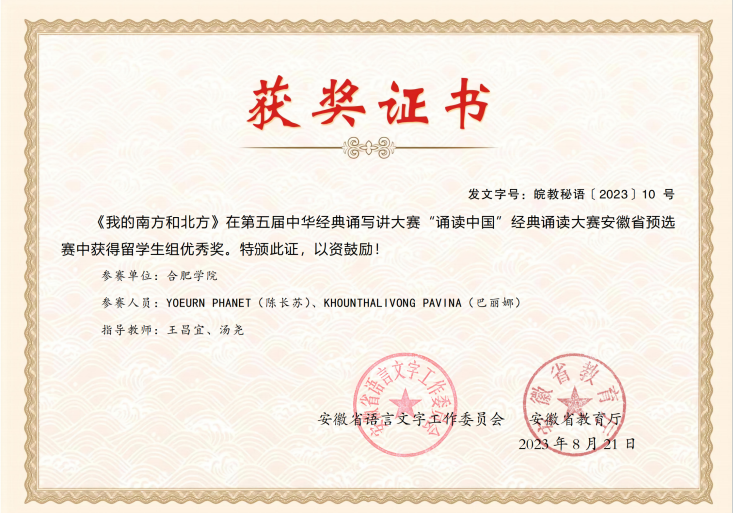 近日,由教育部、國家語委主辦的第五屆中華經典誦寫講大賽“誦讀中國”經典誦讀大賽已完成全部賽程,由我院教師周佳俊、章衡指導,尤禮(TIMALSINA BINITA)、陳欣(SANAVONG NITA)、金皓(VANNHA DAONGEUN)、李敏(CHANTHALATH PHAMEE)、映月(KEOBUASAY PHOUTPHILATH)、王林(BOULOMMAVONG ANOUSEUTH)六位留學生(均為我院留學生)共同誦讀的作品《讀中國》榮獲安徽省三等獎及全國優秀獎;由我院教師王昌宜、湯堯老師指導,陳長蘇(YOEURN PHANET)、巴麗娜(KHOUNTHALIVONG PAVINA)兩位留學生共同誦讀的作品《我的南方和北方》榮獲安徽省優秀獎。