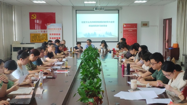 830日上午,語言文化與傳媒學院在五棟二樓會議室舉行了全院教師大會暨期初師德師風學習教育會,學院領導班子成員及全體教職工參加會議。